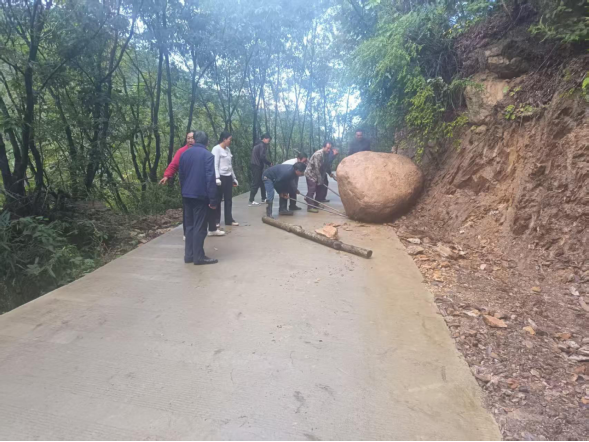 “前面路被石头堵死了,合作社的物资运不进来,村民出门也不方便!”金洞村通组路段,一块巨石横亘路面,严重阻碍交通。镇人大代表曹彩虹在巡查中发现险情后,立即向人大代表联络站站长陈杰明反映。陈杰明迅速召集附近村民携带工具赶往现场。没有大型机械,代表们就带头俯身,与村民一起用撬棍、绳索合力推移石块。汗水浸透衣衫,手掌磨出红痕,大家却毫不松懈,仅用1个多小时便清除路障,恢复道路畅通。为防范后续降雨引发次生灾害,代表们自发组成巡逻队,每日分时段巡查全镇主干道和通村通组路,重点排查边坡落石、路面塌陷等隐患,全力保障群众出行安全。